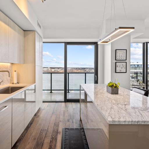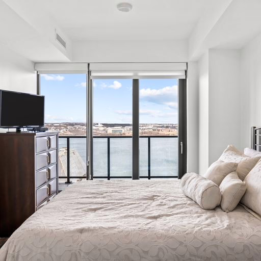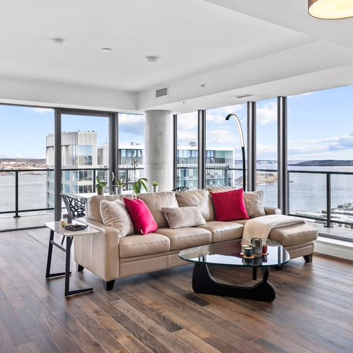 Enter the property and you’ll find yourself in the large foyer. Adjacent to the foyer is a powder room (1/2 bath) and closets. Move forward into the unit and you’ll find yourself in the open concept kitchen/dinning/ living room surrounded with incredible views of the Halifax harbour including Georges and McNabb’s Islands. Off the living room you’ll find the large den. Down the hall off the foyer you’ll find 2 large bedrooms. The master bedroom features a walk-in closet and 4 piece ensuite bathroom. Across from the second bedroom is the second full bathroom and in suite laundry machines. Access to the 475sp/ft wrap around balcony from den, living area and both bedrooms.