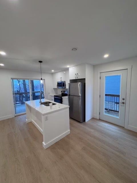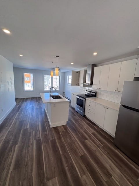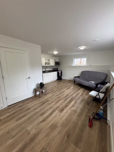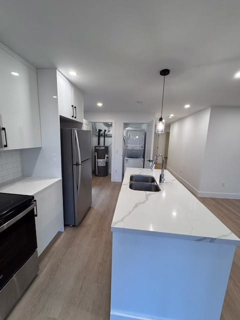 Open concept kitchen/living living room, large windows allowing for lots of natural light. Kitchen includes quartz countertops, and stainless-steel appliances. All appliance shown in photos, including laundry, are included.