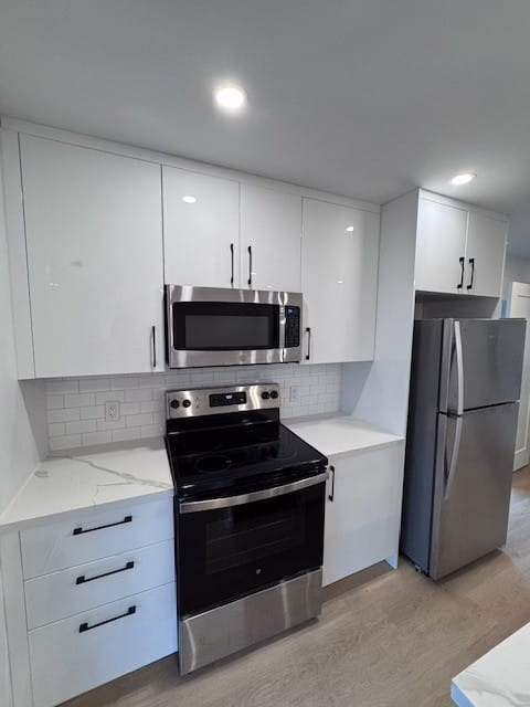 Sleek White Kitchen: Complete with four stainless steel appliances
