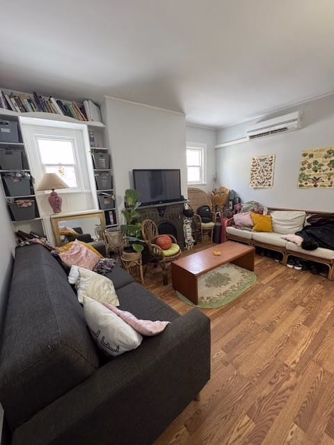 The apartment is bright and open. The bathroom was completely renovated and includes new everything. The 2 bedrooms are large with high ceilings. There is a 3rd room available as a den/office. The kitchen includes all appliances shown in photos, including washer and dryer. Back yard is available for shared use. The living room has a heat pump, which provides efficient heating and air conditioning. The whole apartment was painted, and many areas have new floors.